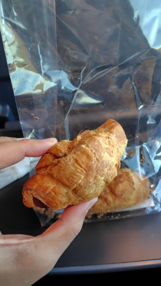 私が予約した運賃では食事なしだったので、車内でスーパー「メルカドーナ」で購入したクロワッサンを美味しくいただきました。